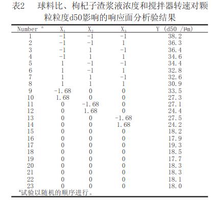 利用響應(yīng)面分析法[1]化枸杞子渣超微粉碎工藝參數(shù)。在單因素預(yù)試驗基礎(chǔ)上,用SAS軟件系統(tǒng)進行響應(yīng)面分析,設(shè)計一個三因素五水平的回歸方程來擬合因素和指標(響應(yīng)值)之間的函數(shù)關(guān)系。選擇球料比(X1)、枸杞子渣漿液濃度(X2)和攪拌器轉(zhuǎn)速(X3)作為因素,以粉碎后的顆粒粒度d50作為響應(yīng)值對球磨機濕法超微粉碎工藝進行化。