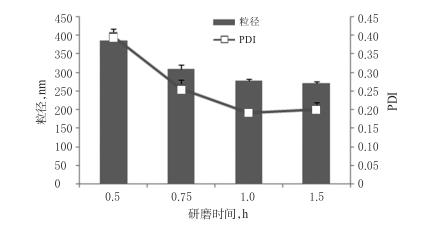2.1.3研磨時(shí)間的篩選稱(chēng)取BRE原料藥7.5g,置于含有吐溫80(1.125g)的水溶液(22.5mL)中,攪拌混懸,加入氧化鋯珠(粒徑為0.6mm)450g,分別研磨0.5、0.75、1.0、1.5h,制備3批BRE納米晶混懸液。以BRE納米晶混懸液的粒徑、PDI為指標(biāo),篩選研磨時(shí)間。結(jié)果,隨著研磨時(shí)間的延長(zhǎng),BRE納米晶混懸液的粒徑、PDI逐漸減小;研磨0.5、0.75、1.0h時(shí),BRE納米晶混懸液的粒徑、PDI減小的幅度較大;研磨1.5h時(shí),BRE納米晶混懸液粒徑雖然較研磨1.0h時(shí)的粒徑減小,但減小幅度不大。綜合考慮能耗和時(shí)間,確定研磨時(shí)間為1h。研磨時(shí)間的篩選結(jié)果見(jiàn)圖3。
